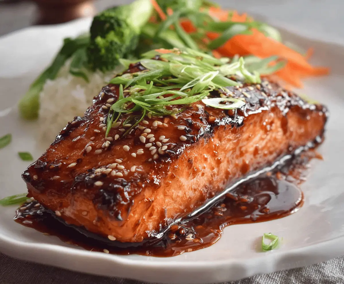 Take the salmon out of the oven and drizzle any remaining glaze over the top. Sprinkle with sliced green onions and toasted sesame seeds for some extra flavor and crunch. Serve immediately with steaming white rice and your choice of greens like bok choy. Enjoy your beautifully plated Asian Glazed Salmon!