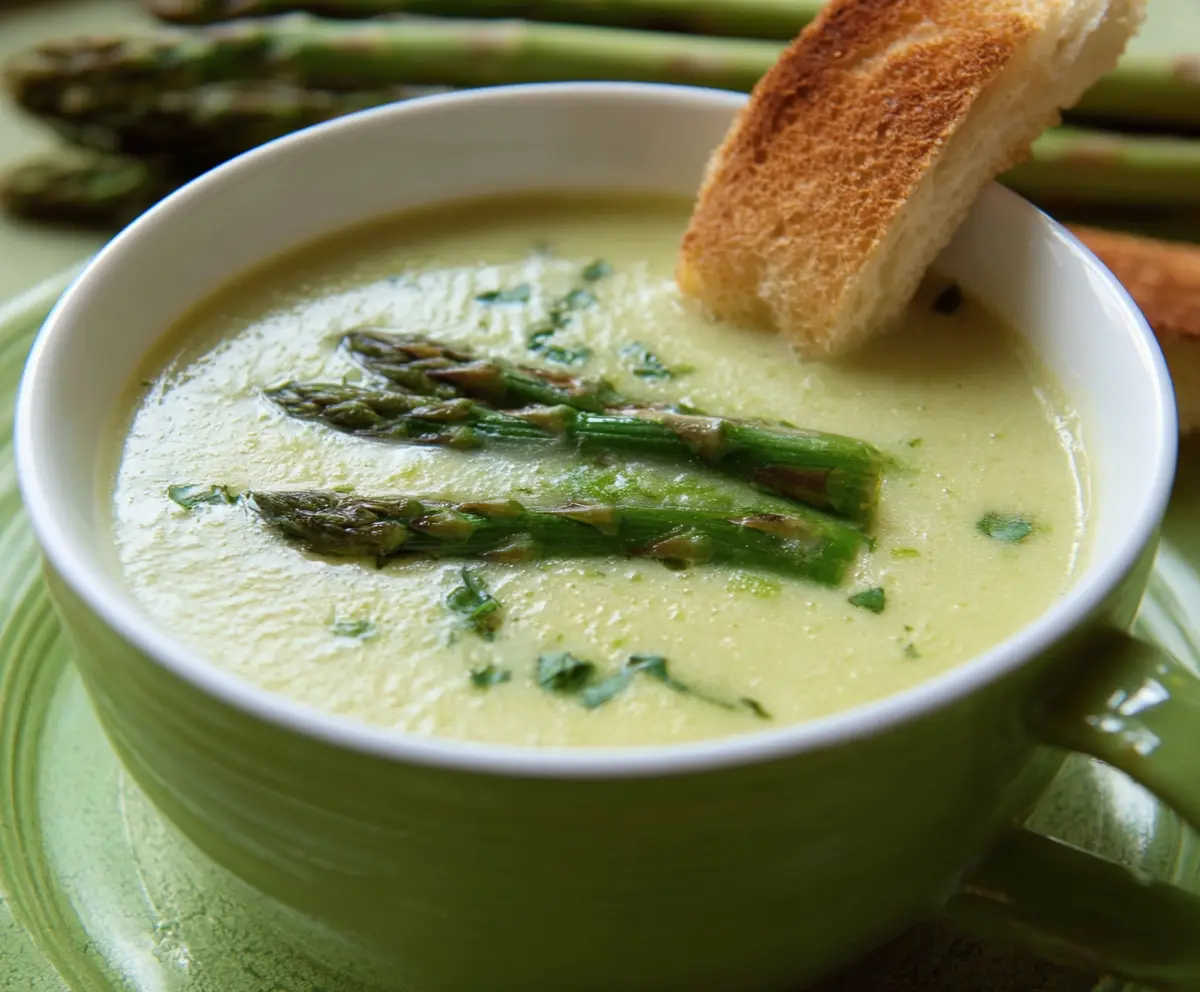 Now it’s time to enjoy! Ladle the warm soup into bowls, garnishing each with the reserved asparagus spears and a sprinkle of chopped chives or parsley. If you like a little spice, add a bit of freshly ground black pepper on top too. Serve hot, and maybe pair it with some crusty bread for dipping.