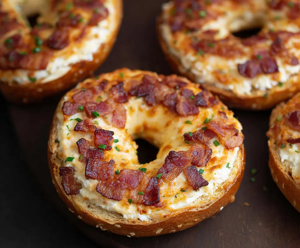 Serve your warm, crispy, creamy, bacon-topped bagels right away. They make a fantastic breakfast or a savory snack—enjoy every delicious bite!