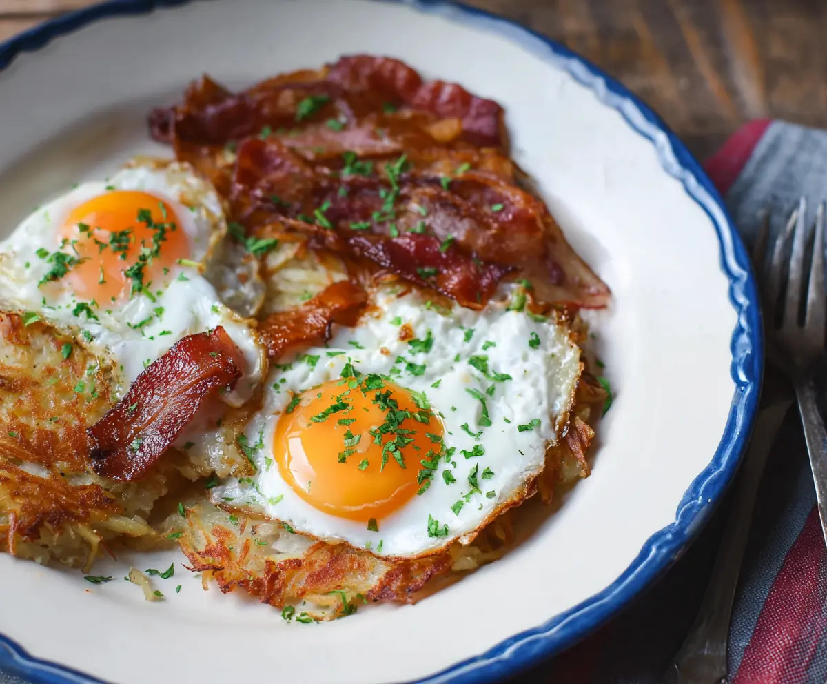 Finish with a sprinkle of fresh chopped chives or parsley for a pop of color and flavor. Enjoy your hearty breakfast of crispy bacon, golden hash browns, and perfectly cooked eggs!
