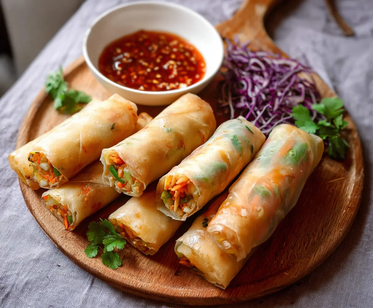 Serve your hot, crispy spring rolls garnished with fresh cilantro leaves and a sprinkle of sesame seeds. Don’t forget the Bang Bang sauce on the side for dipping! Enjoy every crunchy, flavorful bite!