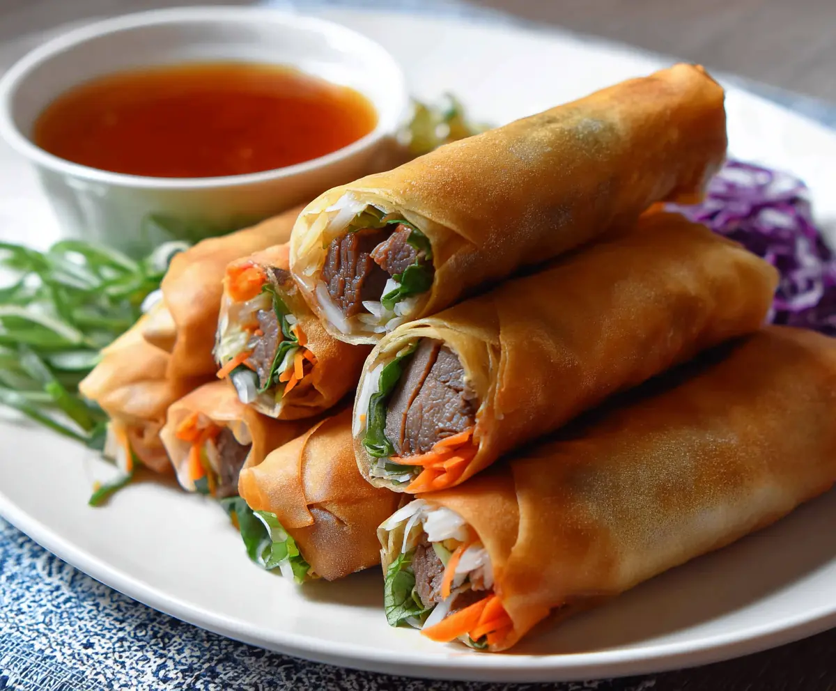 Once they’re cooked, remove the spring rolls with a slotted spoon and let them drain on paper towels. Serve them hot, garnished with fresh herbs and sliced green onions, alongside sweet chili sauce for dipping. Enjoy your crispy and flavorful Beef Spring Rolls!