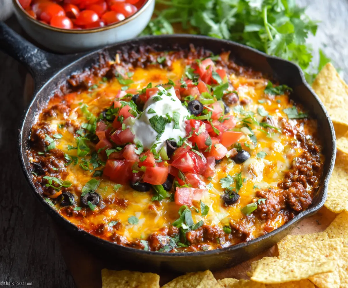 Serve your Beefy Taco Dip hot with tortilla chips for dipping. Enjoy the cheesy, meaty goodness that’s perfect for sharing!
