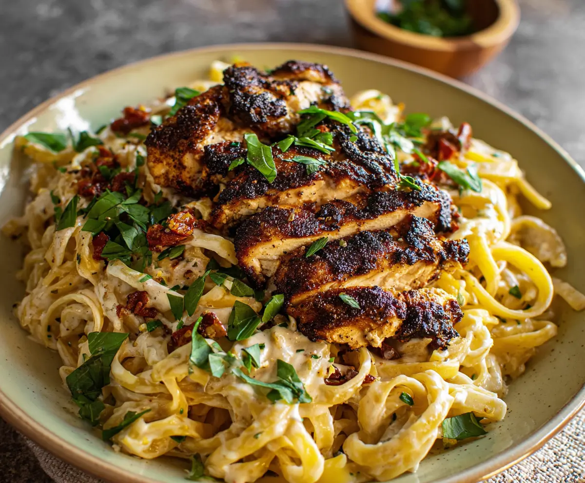 Plate your creamy pasta and top it with the sliced blackened chicken. Garnish with chopped fresh parsley and a sprinkle of additional Parmesan cheese for extra flavor. Enjoy your delightful Blackened Chicken Pasta!