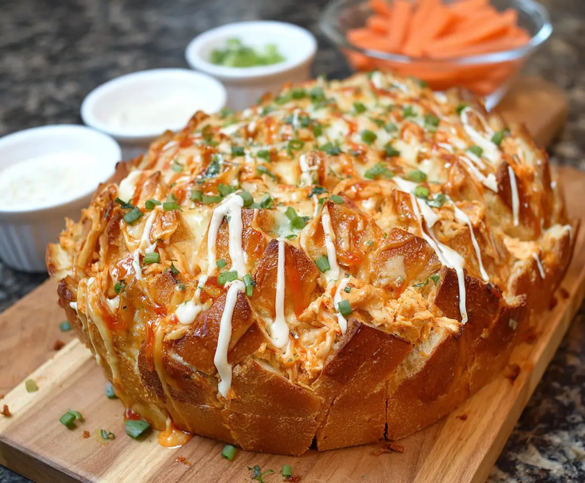 Enjoy your flavorful Buffalo Chicken Pull Apart Bread that combines spicy buffalo chicken, melted cheese, and creamy ranch for a perfect game-day or party appetizer!