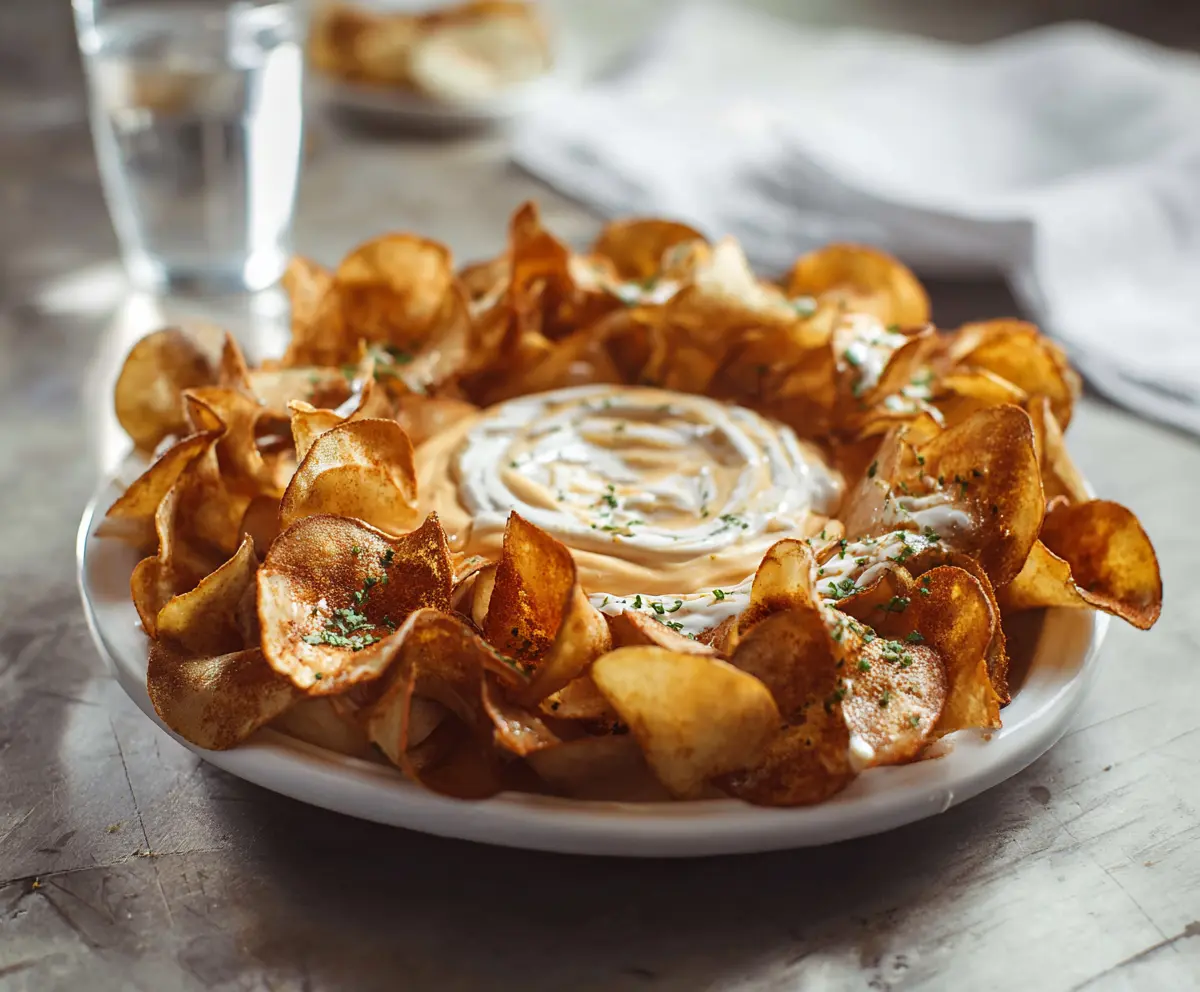 Buffalo chips are crispy, golden potato slices that are perfect for snacking. Paired with a spicy Louisiana hot dip, this dish is a lively party favorite!
