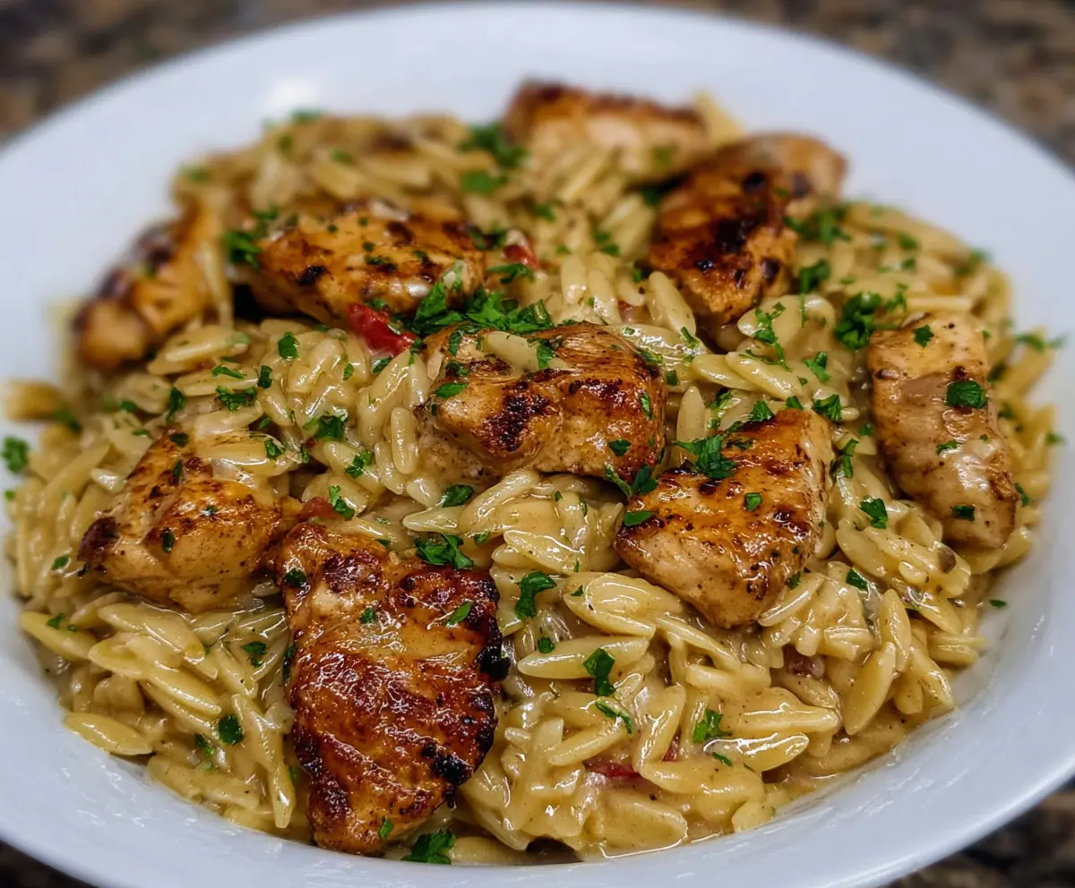 Dig in and savor every creamy and spicy bite of your Cajun Chicken Alfredo Orzo!