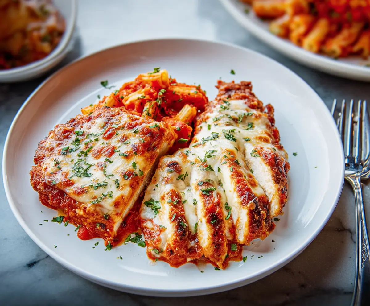 Chicken Parmesan is a tasty dish that features breaded chicken topped with cheesy goodness and marinara sauce. It’s crispy on the outside and juicy on the inside—yum!