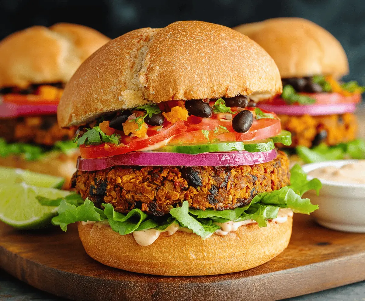 Serve your delicious Chipotle Black Bean Sweet Potato Burgers immediately with lime wedges or your favorite sides. Enjoy these flavorful, hearty burgers that balance smoky chipotle spice with sweet potato creaminess!