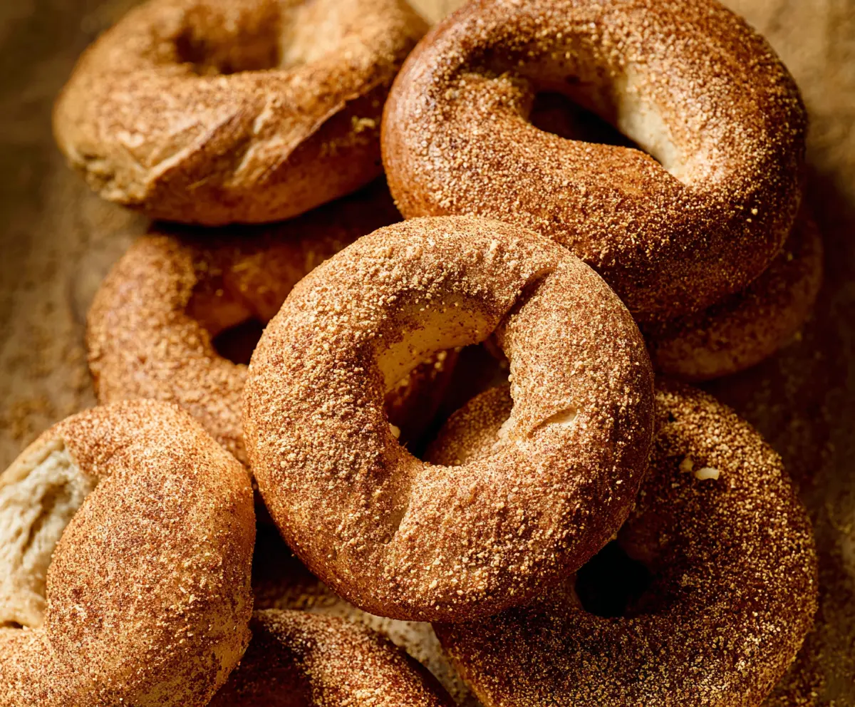 While the bagels are still damp from the boiling, roll or sprinkle them generously in the cinnamon-sugar-nutmeg mixture to coat all sides. This will give them that lovely sweet flavor!