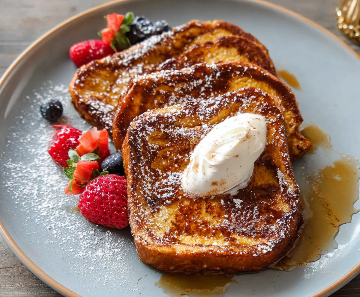 Stack the warm French toast slices on a serving plate. Dust them with powdered sugar for a lovely finish and surround them with fresh berries for added flavor and color.