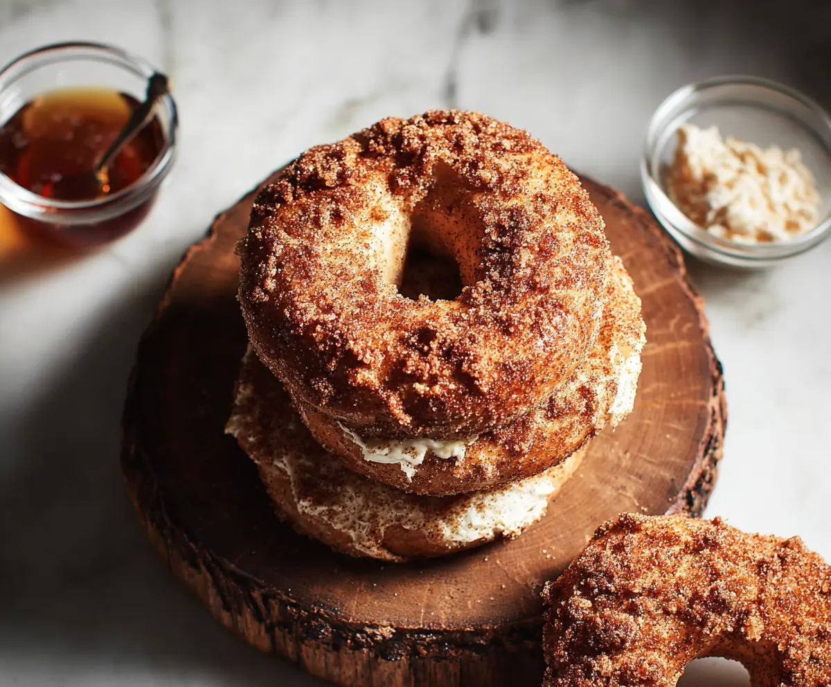 In a shallow bowl, mix together the granulated sugar, ground cinnamon, and finely crushed cornflakes or cereal. While the bagels are still wet from boiling (this helps the coating stick), lightly brush them with a little water or melted butter, then generously coat each bagel with the cinnamon sugar mixture, pressing gently to ensure it sticks!