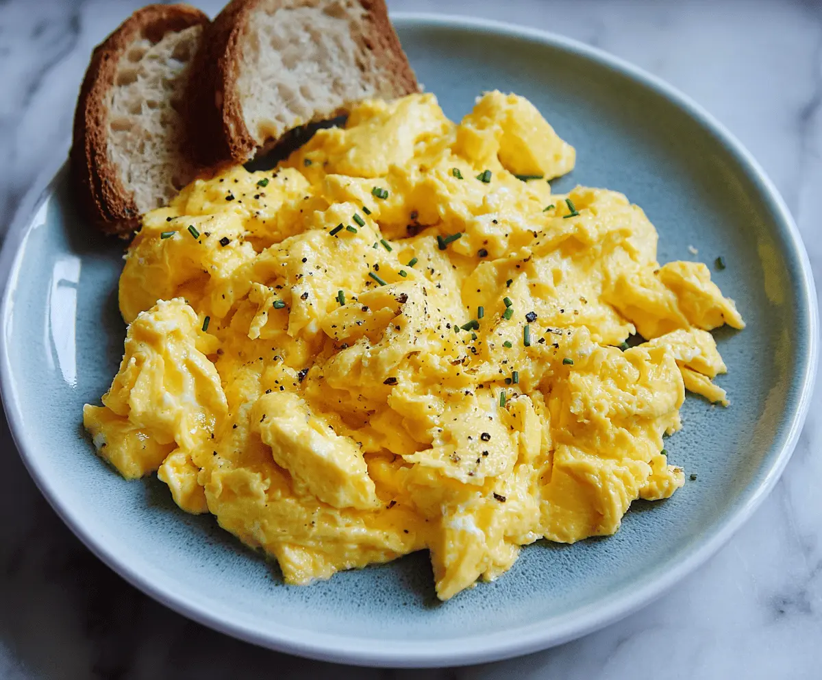 Transfer your scrambled eggs to a plate and garnish with freshly chopped chives or parsley for a lovely touch. If you’d like, serve them with a slice of toasted rustic bread or sourdough on the side for a complete meal.