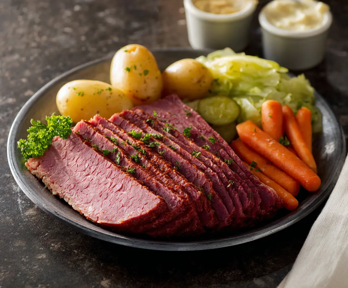 Arrange the sliced corned beef on the plate with the vegetables. Don’t forget to sprinkle some fresh chopped parsley on top for a nice touch of color.
