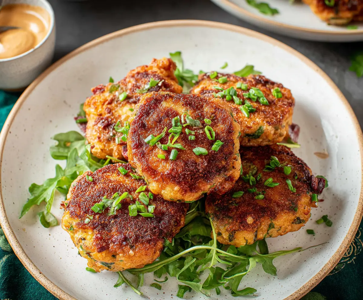 If you like, garnish your fritters with extra chopped green onions or herbs. Enjoy your warm, crispy fritters!