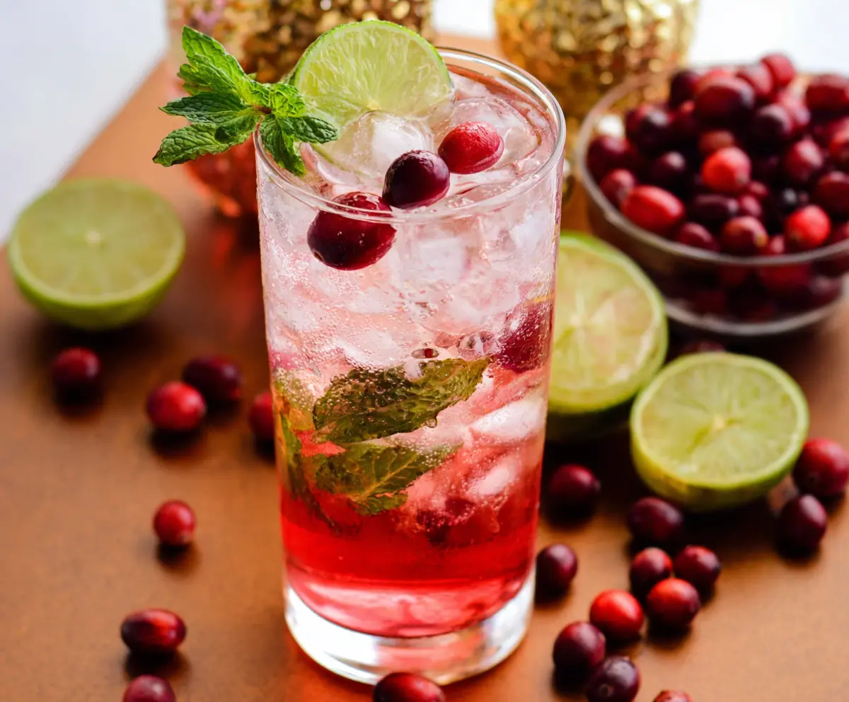 Using a spoon or a straw, gently stir the drink to mix everything together. For the final touch, garnish with a sprig of mint, a slice of lime on the rim, and drop a few whole cranberries on top for a festive look.