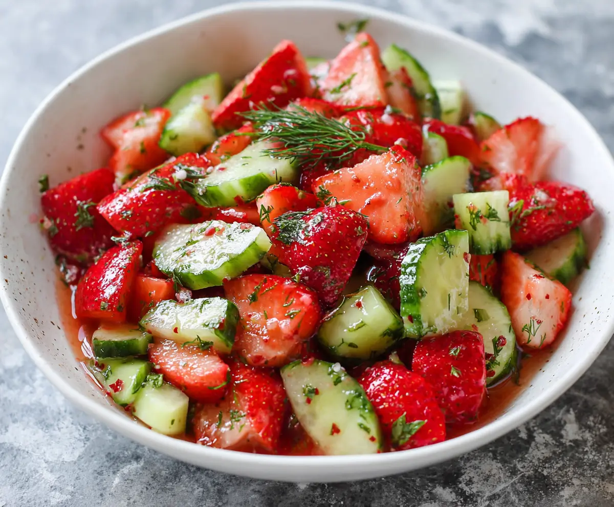 This refreshing cucumber strawberry salad is a lovely mix of crisp cucumbers and sweet strawberries. Toss in a bit of mint and a splash of dressing for a tasty treat!