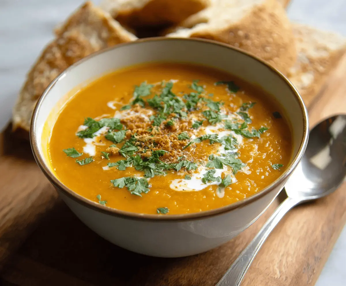 Serve the soup hot, garnished with a swirl of coconut milk and a sprinkle of chopped fresh cilantro. If you like, enjoy it with some crusty bread on the side for dipping. It’s cozy and comforting—perfect for any day!
