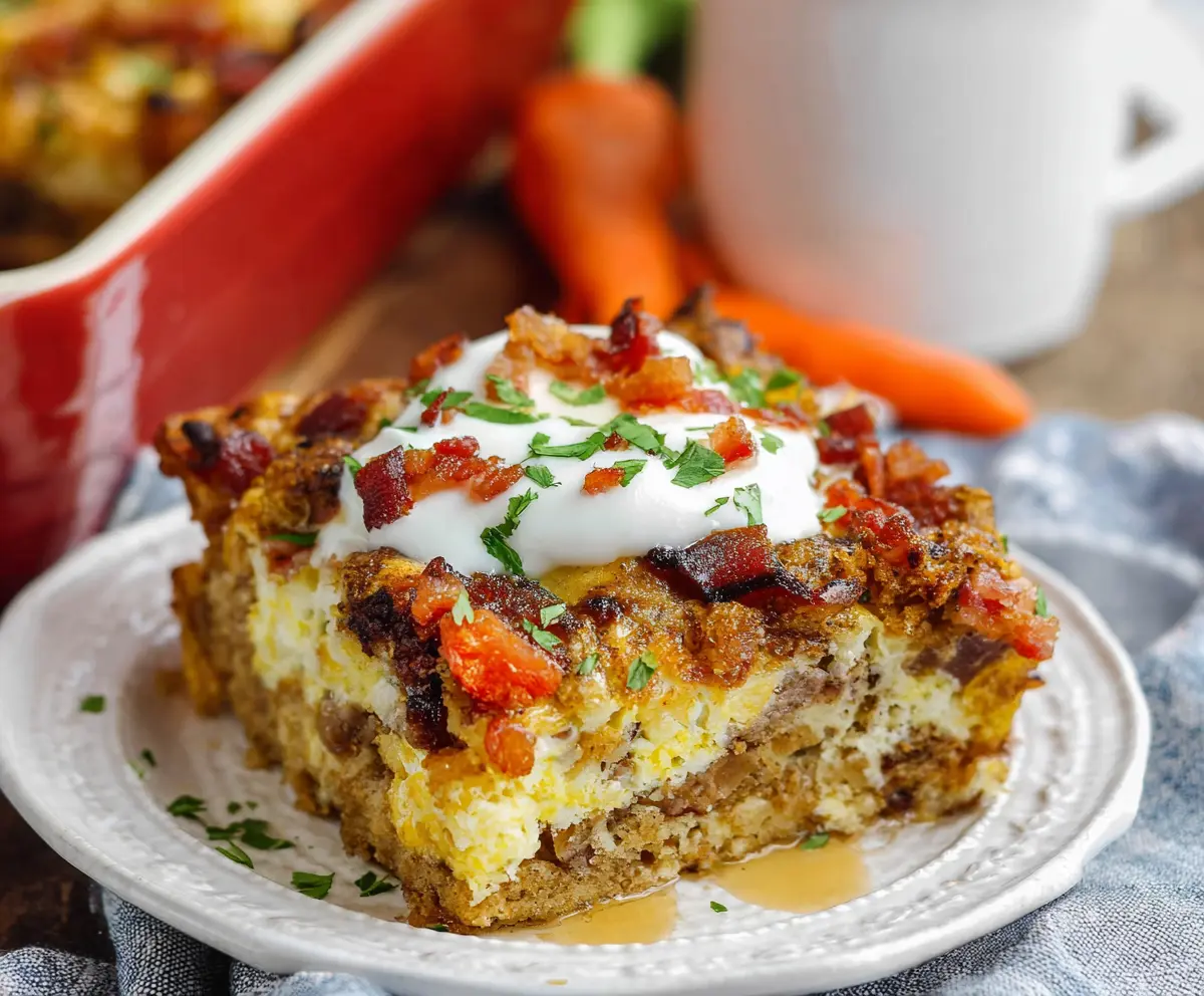 This dish combines savory sausage, crispy bacon, tender bread, veggies, and a creamy egg base topped with a dollop of sour cream and fresh herbs, perfect for a festive holiday breakfast!
