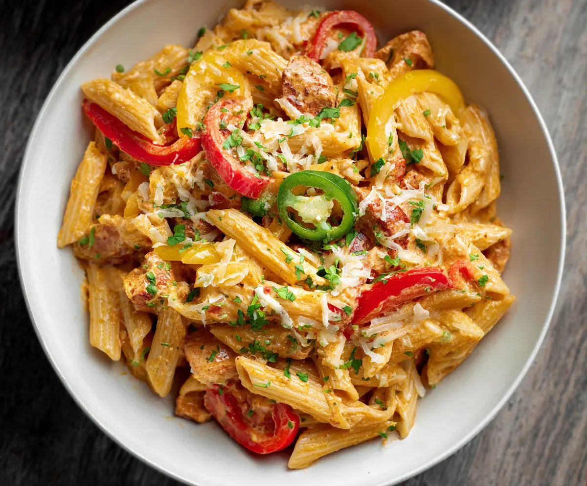Serve your creamy, spicy fajita pasta warm and enjoy every bite of this flavorful dish! Perfect for any mealtime!