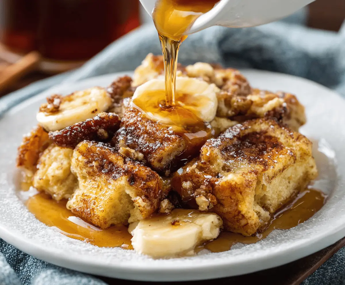 Once baked, remove the casserole from the oven and let it cool slightly before cutting it into squares. Dust the top with powdered sugar, and if you like, add banana slices or berries. Serve warm with a drizzle of maple syrup or honey for that perfect finish!