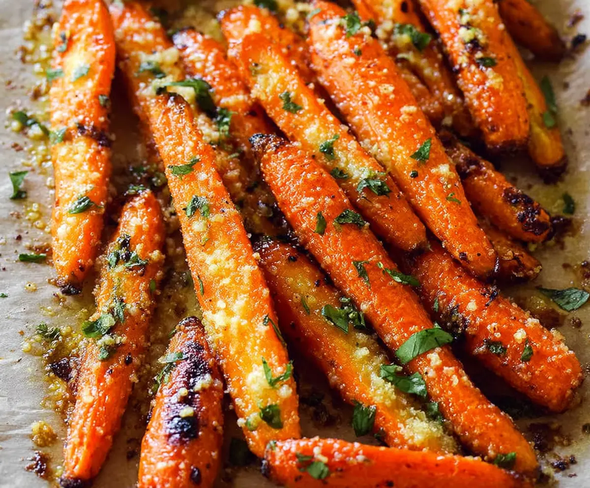 Once the carrots are tender and nicely caramelized, remove them from the oven. While they’re still hot, sprinkle the grated Parmesan cheese and chopped parsley over the top. Toss the carrots gently to mix everything together, allowing the cheese to melt slightly from the heat of the carrots.
