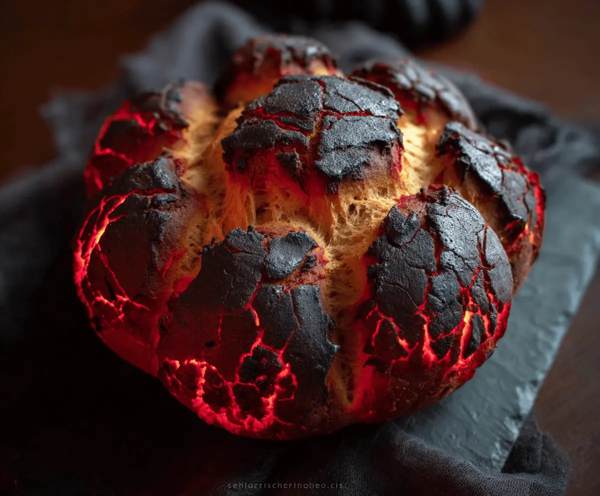 Let the bread cool on a rack before serving. It should look like cracked black volcanic rock with spooky red highlights—truly fit for Halloween! Slice and enjoy this delicious and spooky treat with friends and family.