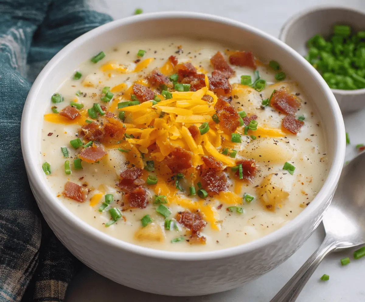 Pour the soup into bowls and top generously with crumbled bacon, a sprinkle of extra cheddar cheese, and some chopped chives or green onions for that fresh flavor.