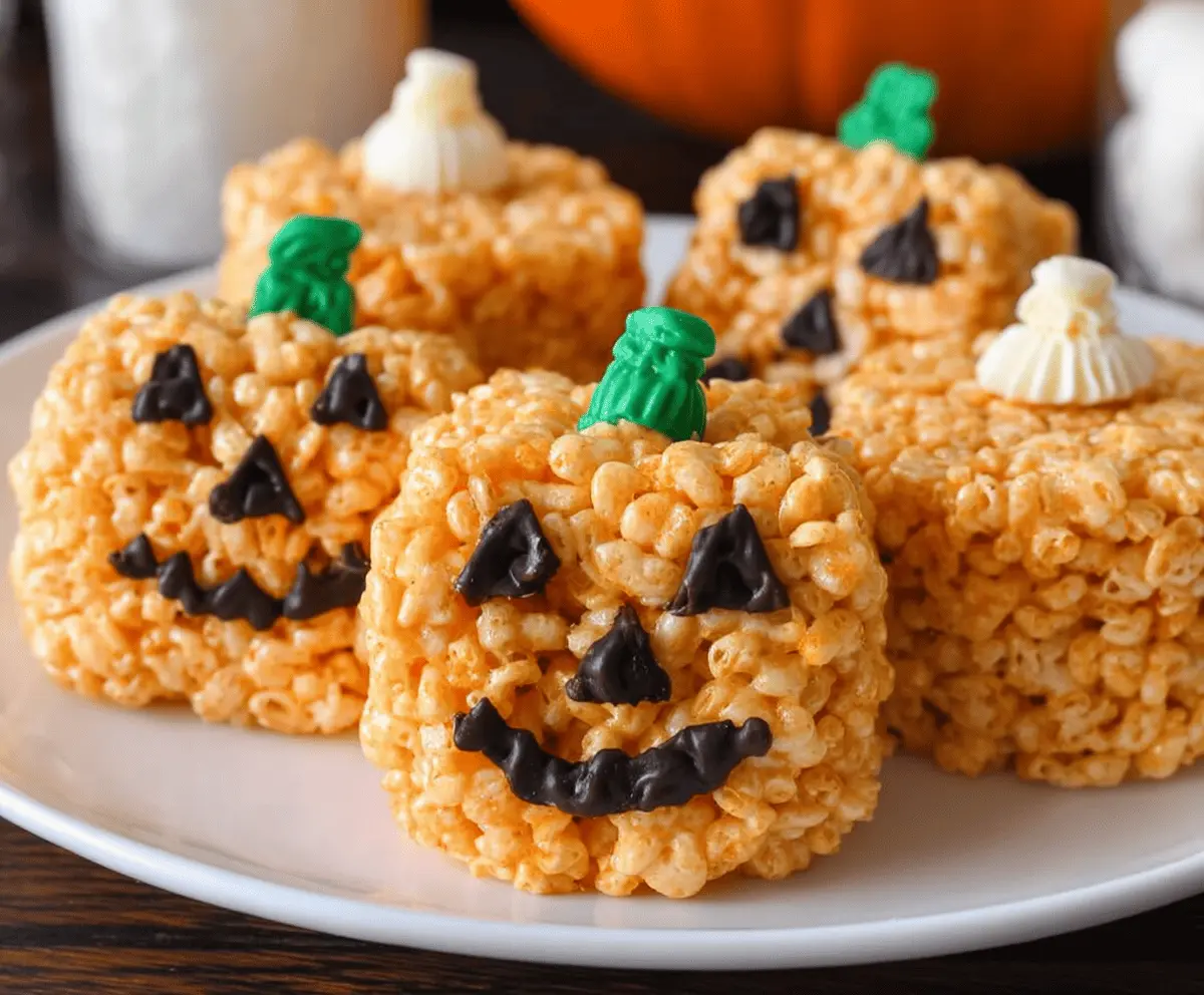 These Jack o Lantern Rice Krispie Treats are a fun and yummy Halloween snack! They combine crispy rice cereal with gooey marshmallows, all shaped like cute little pumpkins.