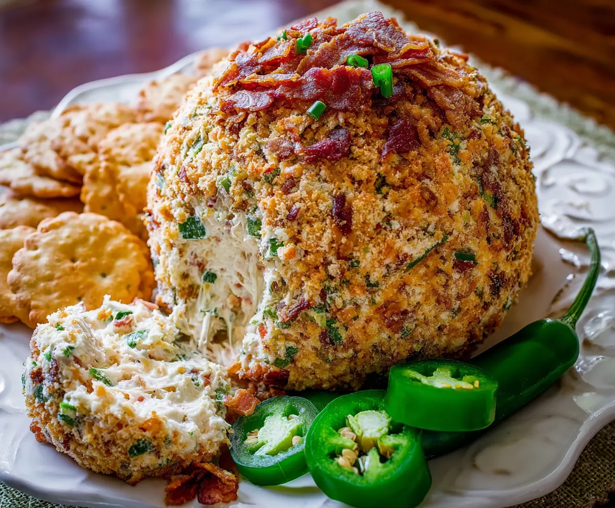 Place the coated cheese ball on a serving plate. For a decorative touch, garnish the top with freshly sliced jalapenos and sprinkle on some extra bacon bits.