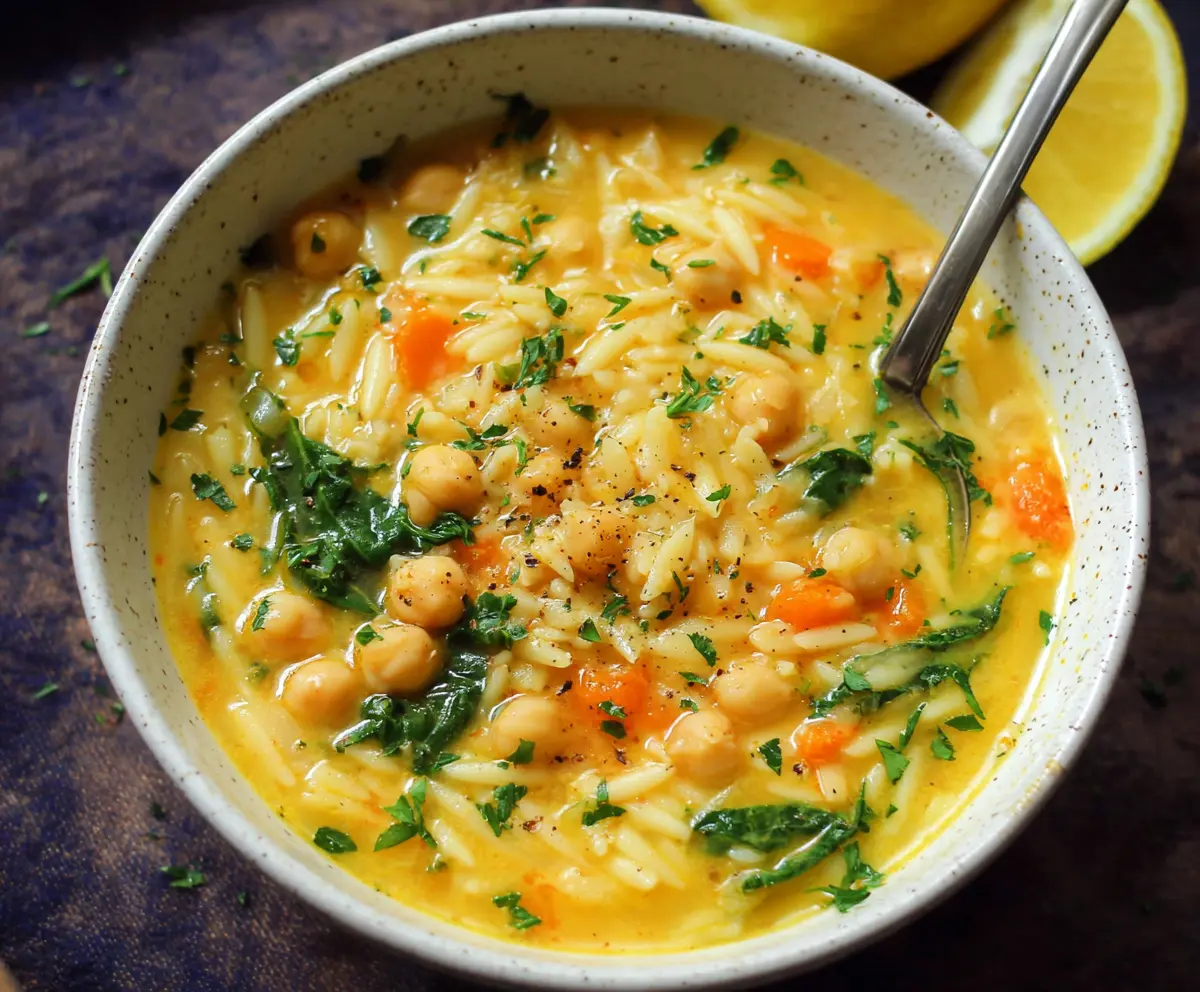 This Lemon Chickpea Orzo Soup is a bright and tasty dish that warms you up! Packed with healthy chickpeas, tender orzo, and zesty lemon, it’s perfect for a cozy day.