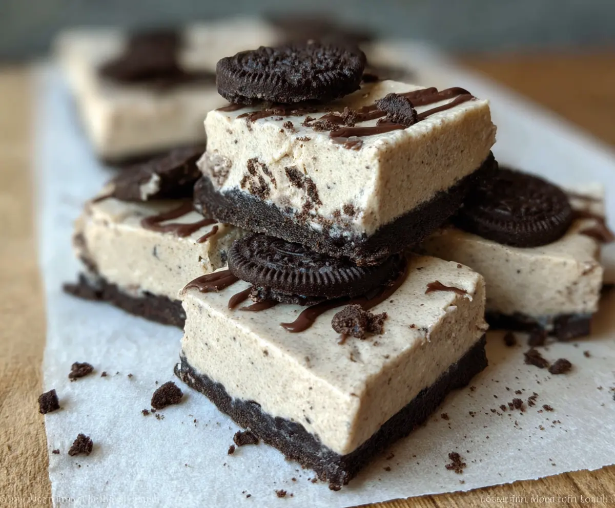 Once set, use the parchment paper to lift the bars out of the pan. Cut them into squares or rectangles. Serve chilled and enjoy your delicious, creamy, no-bake Oreo protein bars!