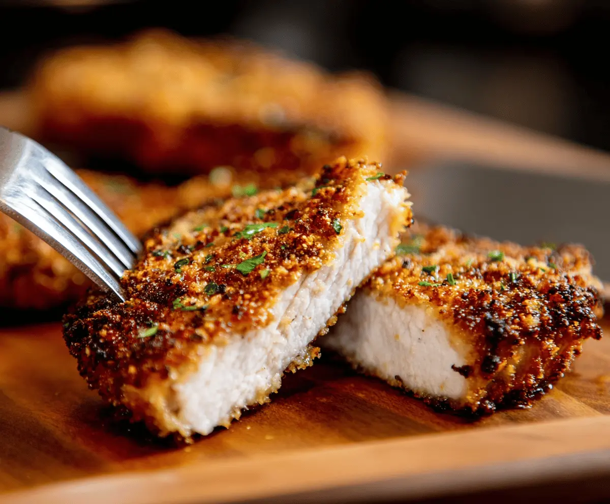 Create three shallow dishes for the breading process. Put flour in one dish, beaten eggs in another, and mix panko breadcrumbs with Parmesan, garlic powder, paprika, and herbs in the last dish. This makes it easy to coat the pork chops evenly.