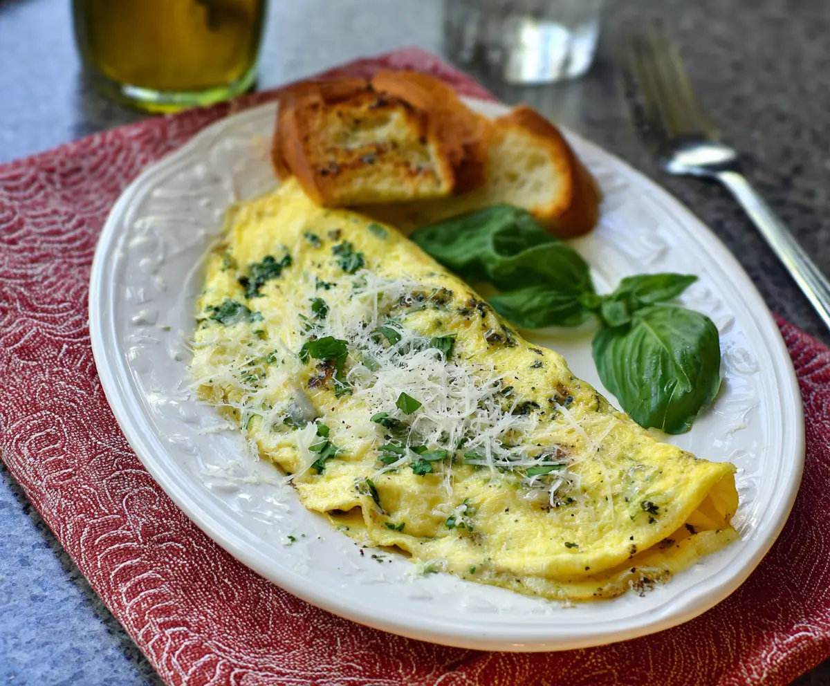 Carefully slide the omelet onto a plate. Sprinkle with extra Parmesan cheese, and garnish with freshly chopped herbs and a few whole basil leaves for a pop of color. Serve immediately and enjoy your delicious homemade omelet!