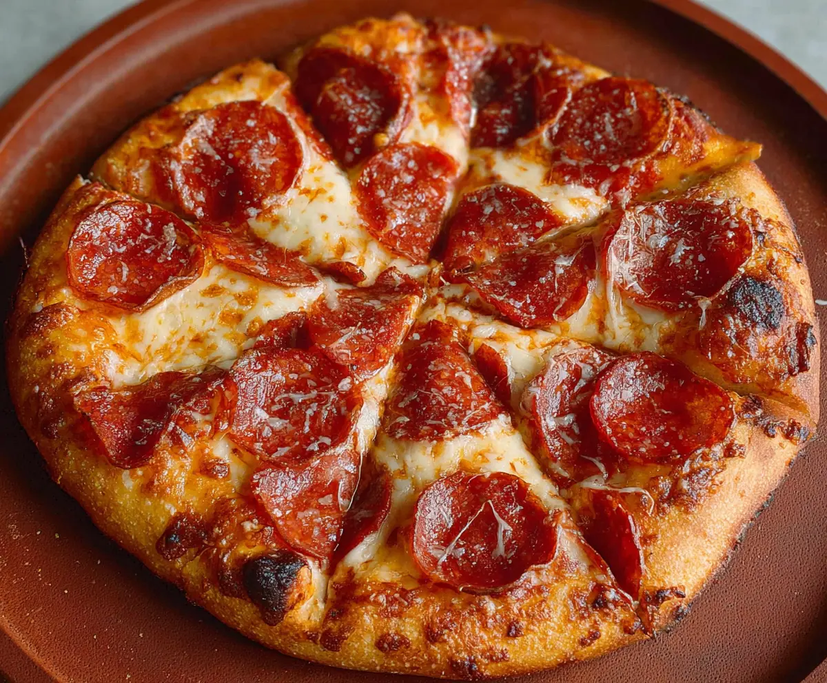 This classic pepperoni pizza is a fan favorite! With a crispy crust, rich tomato sauce, gooey cheese, and spicy pepperoni slices, it’s pure comfort food.
