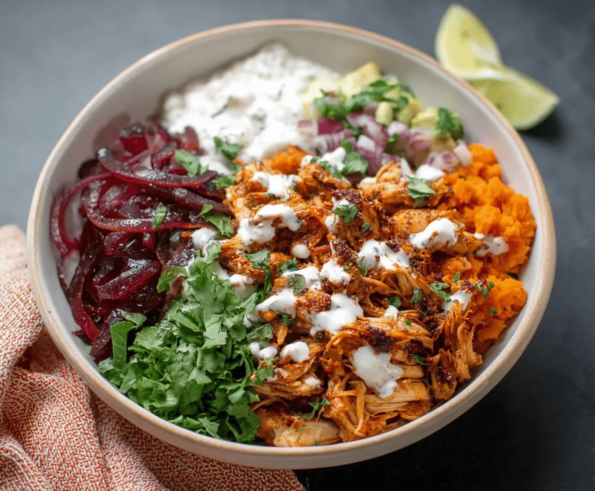 These Pulled Chicken Sweet Potato Bowls are a tasty mix of tender chicken and sweet potatoes, perfect for a cozy meal. Add your favorite veggies and a drizzle of sauce to make it yours!