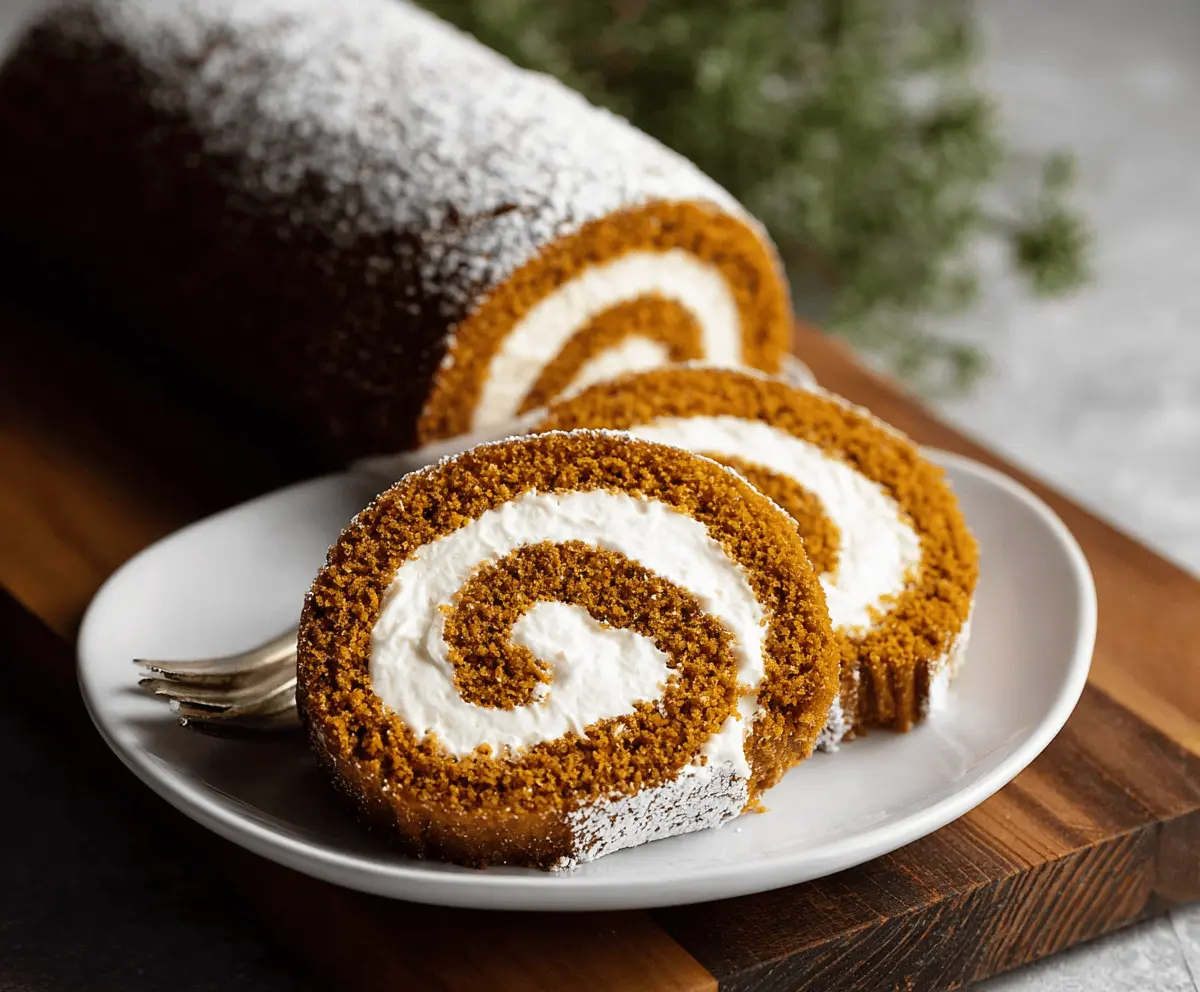 Place the rolled cake seam-side down on a serving plate and dust the top with powdered sugar. Chill it in the refrigerator for at least one hour before slicing. This will help it set and make it easier to cut. Once you’re ready, slice the roll and enjoy this delightful pumpkin-flavored dessert!