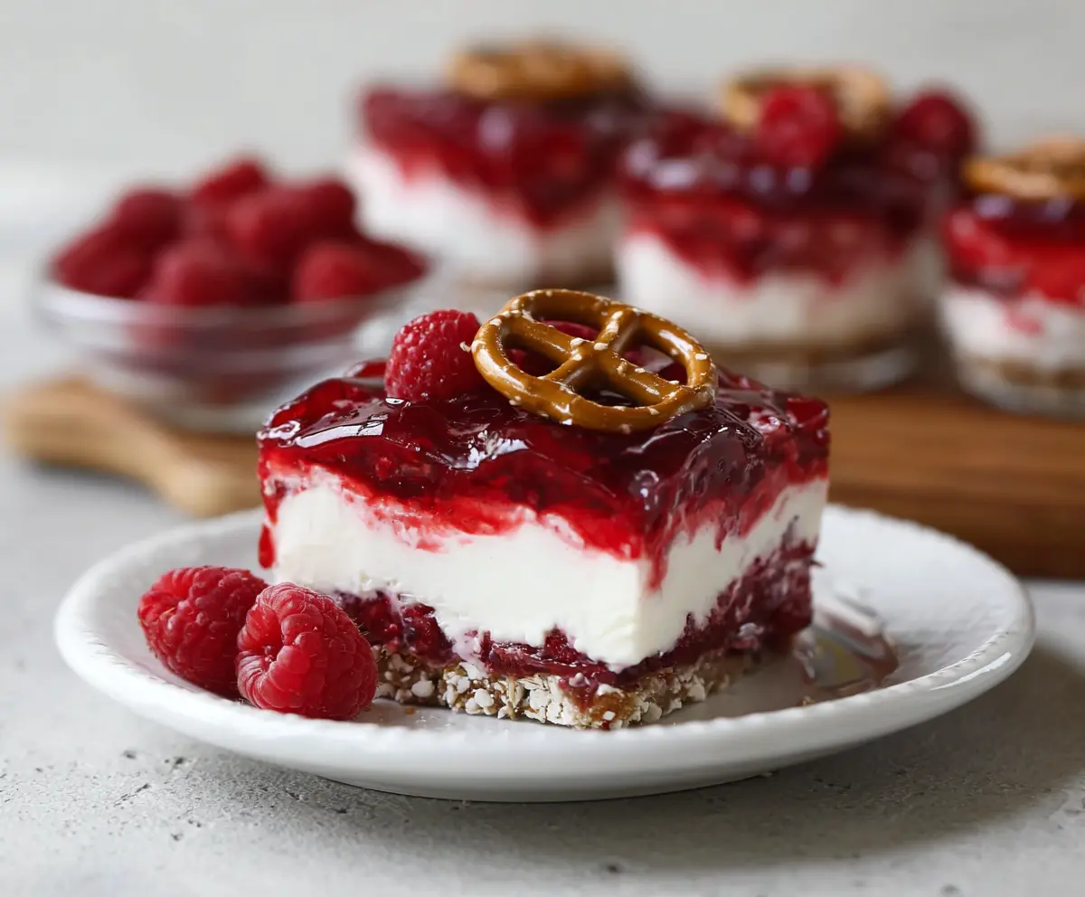 Before serving, garnish each slice with a pretzel, fresh raspberries, and a sprinkle of coarse sea salt if desired. Cut into squares and serve chilled. Enjoy this tasty balance of salty, sweet, and tangy flavors!
