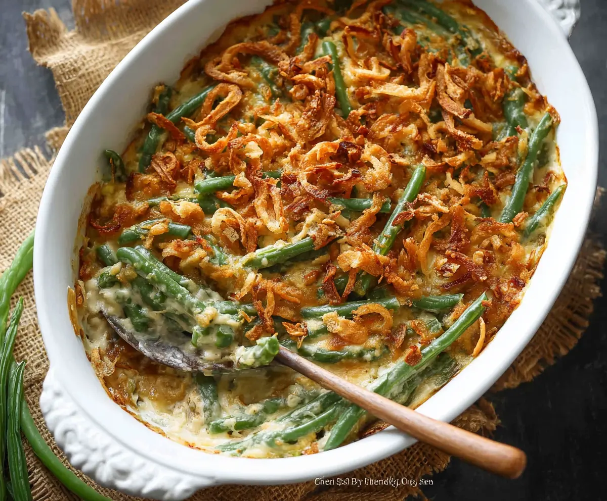 Once done, take the casserole out of the oven and let it cool slightly before serving. Now you have a creamy, comforting green bean casserole ready to be enjoyed, topped with crispy fried onions just like in the images!