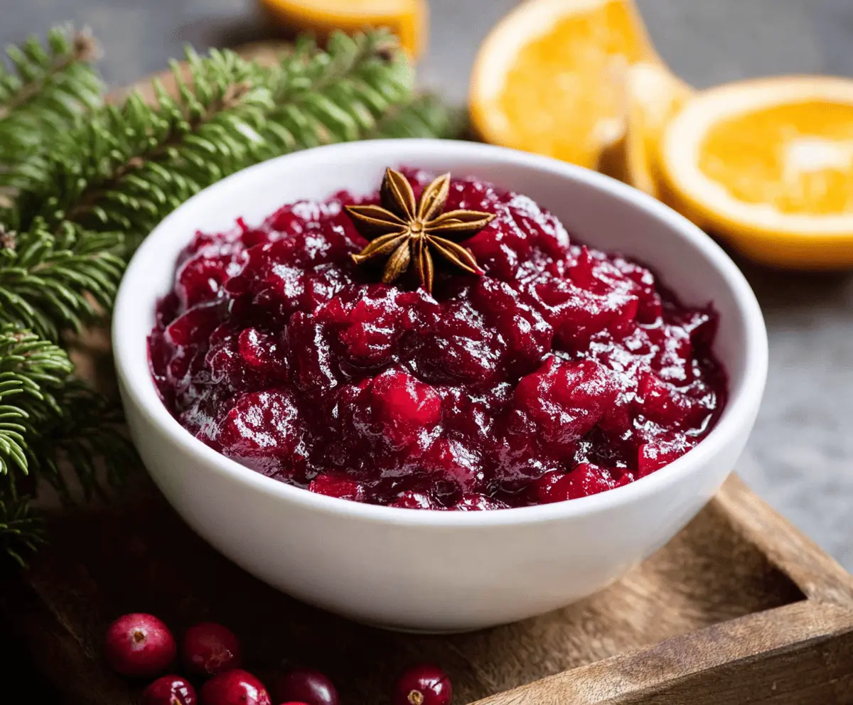 Vibrant spiced cranberry sauce with orange and ginger in a rustic bowl.