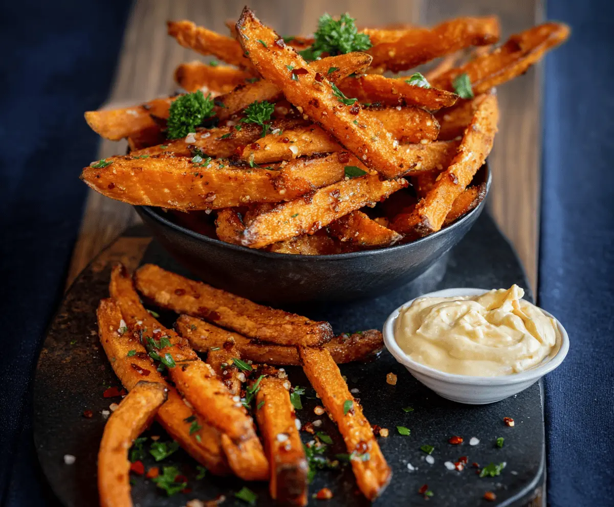 Crispy spicy garlic sweet potato fries served with dipping sauce on a rustic wooden platter