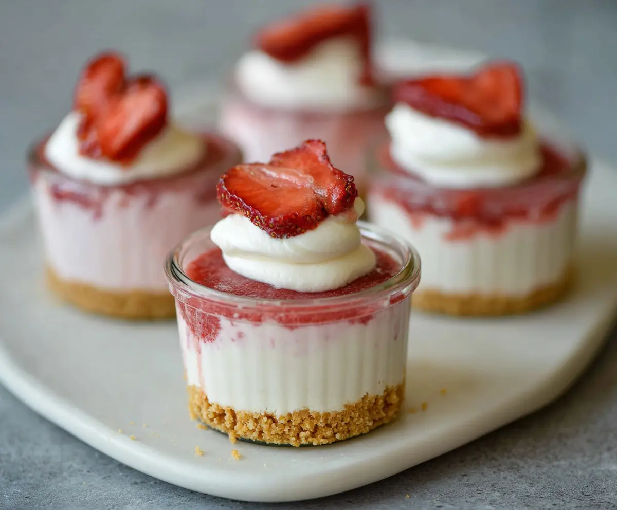 When ready to serve, top each cheesecake cup with sliced fresh strawberries, a teaspoon of strawberry jam, and a dollop of whipped cream or Greek yogurt if you like. Optionally, sprinkle some extra graham cracker crumbs on top for a crunchy finish.