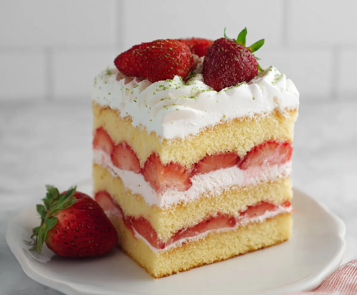 Start with one cake layer on a serving plate. Spread a generous layer of whipped cream on top, followed by half of the macerated strawberries (juice and all). Carefully place the second cake layer on top. Repeat the layering process with whipped cream and the remaining strawberries. If you’re making a three-layer cake, add a third layer and then spread whipped cream on top and around the sides of the entire cake. Decorate the top with whole strawberries and dollops of piped whipped cream for a beautiful presentation!