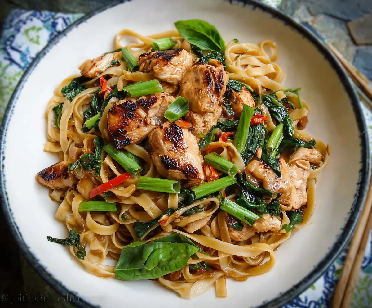 This dish beautifully combines smoky grilled chicken flavor, aromatic Thai basil, and savory sauces over comforting rice noodles. It’s a wonderful meal full of vibrant colors and tastes!
